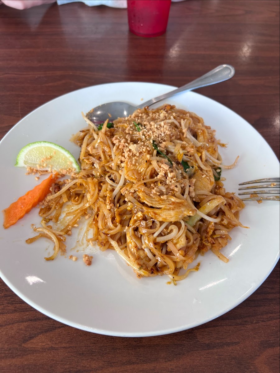 I had the Pad Thai and it was amazing, it is my favorite dish at Thai restaurants. The Pad Thai here was great next time I will try it with the Chili peppers they offered me next time. The staff was excellent at service, the food came out hot, checked up on me to refill my water, and to ask how was my food. Overall it is my Favorite Thai restaurant in Chattanooga. I would recommend anyone visiting Chattanooga to stop here at least once. To get here you will have to go into the walmart parking lot and go all the way to the end of that shopping center on the other side of it closest to the Walmart, Very tiny restaurant but what it lacks in size it does not lack in taste and customer service.